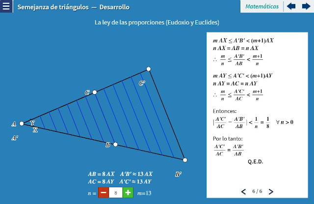 Objetivo: El objetivo de esta unidad es mostrar gráficamente al estudiante la semejanza de triángulos cuando comparten 1) un mínimo de $2$ ángulos o, 2) cuando comparten un ángulo y sus lados adyacentes son proporcionales entre sí. Se demuestra que los triángulos semejantes tienen sus lados proporcionales. La presentación de esta unidad es equivalente a la teoría de las proporciones de Eudoxo que se encuentra en el libro V de Los Elementos de Euclides.