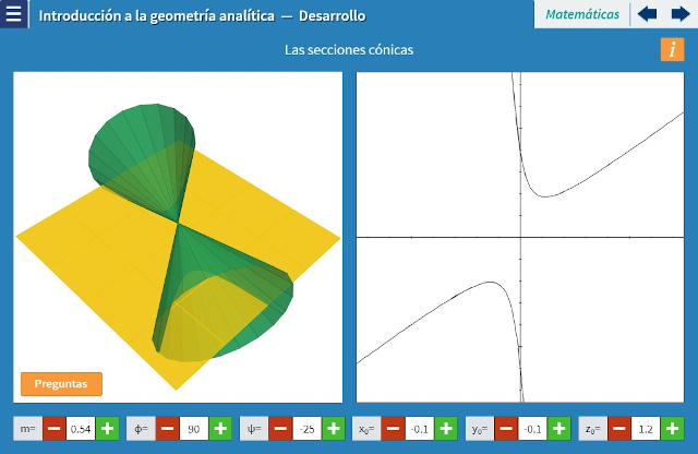 Objetivo: El objetivo de esta unidad es familiarizar al alumno con las curvas básicas de la geometría analítica, así como mostrar gráficamente que provienen de cortar un cono con un plano (a lo cual se debe el nombre “secciones cónicas”). En una de las escenas el usuario puede manipular la apertura, inclinación y posición del cono para hacer evidente que es posible construir las cuatro secciones (circunferencia, elipse, parábola e hipérbola) con cortes del cono. Se muestra la equivalencia entre las secciones cónicas y la ecuación general de segundo grado en dos variables.