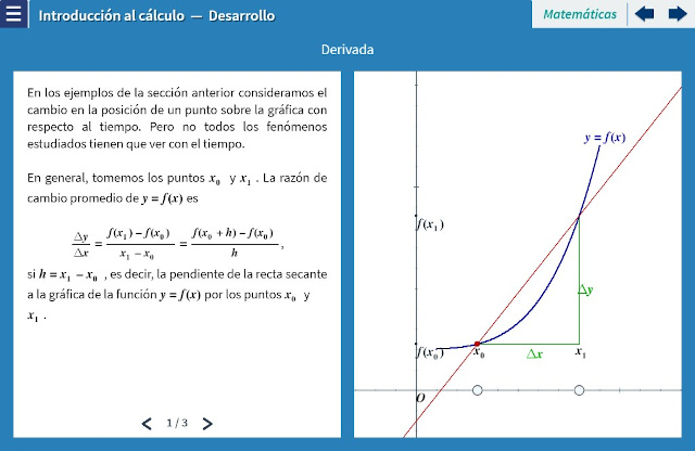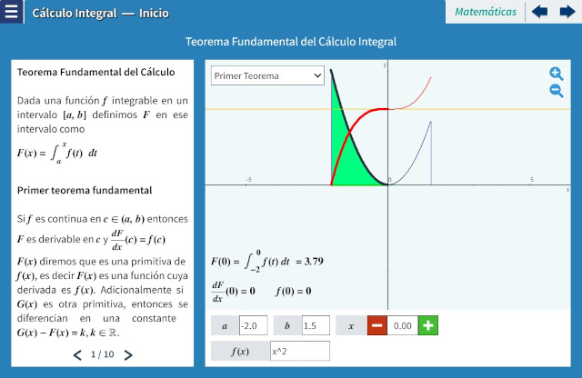 Objetivo: El objetivo de esta unidad es presentar al alumno los tres conceptos fundamentales del cálculo: el límite, la derivada y la integral, y el teorema fundamental del cálculo. El alumno podrá experimentar con los interactivos observando que el cálculo se basa en problemas de resolver límites, ya sea el límite de la suma de polígonos para el caso de la integral, o el límite de la pendiente de dos puntos arbitrariamente cercanos en una curva para la derivada. Se explica que el teorema fundamental del cálculo permite relacionar a la derivada e integral como funciones inversas.