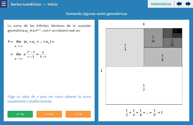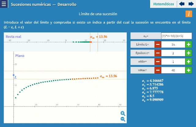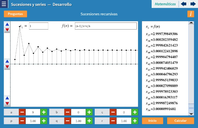 Objetivo: El objetivo de esta unidad es introducir al alumno al concepto de sucesión. Para ello, se proporciona una ecuación inicial, cuyos parámetros pueden modificarse. El alumno puede editar la ecuación misma para probar ecuaciones de su elección. La sucesión se calcula paso a paso para observar cómo cambia respecto al parámetro $n$. Es posible observar, en caso de que la haya, que la sucesión tiene una cota que no es rebasada, y ésta es gráficamente representada por una recta para introducir el concepto de asíntota. Lo mismo se hace con sucesiones generadas mediante la aplicación recursiva de una función y las sucesiones correspondientes a una serie.