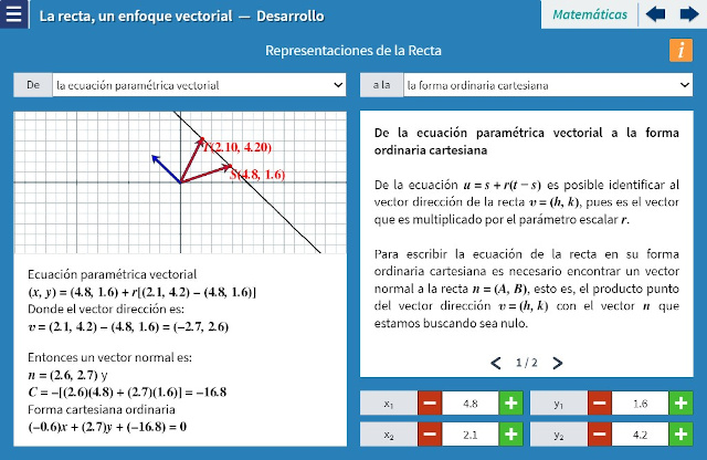 Objetivo: La intención de esta unidad didáctica es mostrar al usuario cómo a partir de operaciones entre vectores se puede definir una recta y se puede obtener información de la misma a través de los elementos que conforman su ecuación vectorial. El enfoque vectorial permite estudiar aplicaciones directas de la recta como la distancia de un punto a una recta, identificación de rectas paralelas y perpendiculares, obtención del punto de intersección entre dos rectas y también la obtención del ángulo entre dos rectas.
