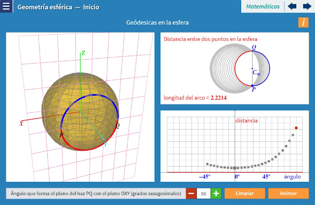Objetivo: Se determina la trayectoria mínima sobre una esfera entre dos de sus puntos, es decir se determina la geodésica entre esos dos puntos. Se define qué es un segmento esférico y un triángulo esférico. Se comprueba que la suma de los ángulos de un triángulo esférico es superior a $180º$ Y se muestra que la geometría esférica no es una geometría ecuclídea, que hay otras geometrías.