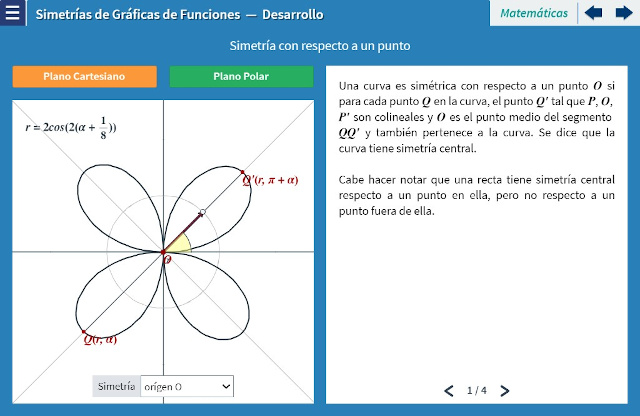 Objetivo: El objetivo de esta unidad es adquirir los conceptos de simetría con respecto a una recta y con respecto a un punto en el plano cartesiano y definir los criterios algebraicos que caracterizan dichas simetrías, tanto en coordenadas cartesianas como en coordenadas polares, haciéndo énfasis en las funciones trigonométricas.