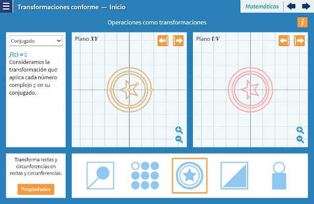 Objetivo: Se estudian las aplicaciones del plano que preservan el ángulo de intersección entre dos curvas, esto es, aquellas que transforman dos curvas que se cortan en un punto con un determinado ángulo en otras dos curvas que se cortan con el mismo ángulo. Estas transformaciones se utilizan en problemas de física matemática gobernados por la ecuación de Laplace ya que permiten convertir un problema de contorno en el plano $XY$ en uno más simple en el plano $UV$.