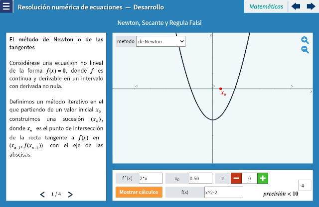 Objetivo: Resolver una ecuación $f(x)=0$ es determinar aquellos valores que verifican esa igualdad. La teoría de Galois muestra cómo las ecuaciones polinómicas -las que podemos considerar como las más sencillas al intervenir sólo sumas, restas y multiplicaciones- de grado mayor o igual que cinco no son resolubres por radicales, es decir, que no puede encontrarse una expresión algebráica que permita calcular sus raíces. Por tanto sólo sabemos cómo resolver unos pocos tipos de una infinidad de ecuaciones. Es necesario proceder a determinar soluciones aproximadas con una precisión deseada y para ello se utilizan metodos iterativos que a partir de un valor inicial se construye una sucesión de valores que converja a una solución. En esta unidad se busca aprender los siguientes métodos iterativos para la resolución de ecuaciones: