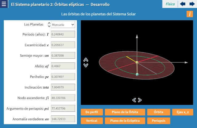 Objetivo: Se presentan los parámetros keplerianos que se utilizan para definir una trayectoria elíptica en el espacio. En particular se explican los conceptos de equinoxio vernal, período, excentricidad, semieje mayor, perihelio, afelio, longitud del nodo ascendente, longitud de periapsis y anomalía verdadera. Se explica la Primera ley de Kepler que consiste en que todos los planetas siguen trayectorias del tipo descrito y se presentan los valores característicos de la órbita de cada uno de los planetas. Se discuten brevemente las diferencias entre ellos.