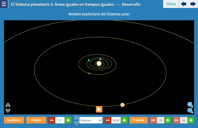 Objetivo: El objetivo de esta unidad es presentar la Segunda Ley de Kepler que dice que los radios vectores, i.e.los segmentos del Sol a cada planeta, barren áreas iguales en tiempos iguales. Se discute el significado de esta ley y se muestran sus implicaciones en la capacidad de predecir la posición de todos los planetas en todo momento a partir de las de un momento dado. La unidad presenta una escena que hace precisamente eso.