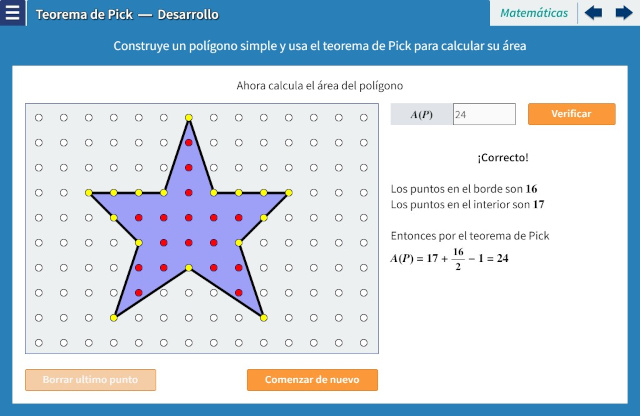 Objetivo: Presentar un resultado poco conocido para el cálculo del área de polígonos simples cuyos vértices se encuentran en coordenadas enteras: el Teorema de Pick. Se trata de una herramienta muy útil que es, además, fácil de utilizar y aprender.