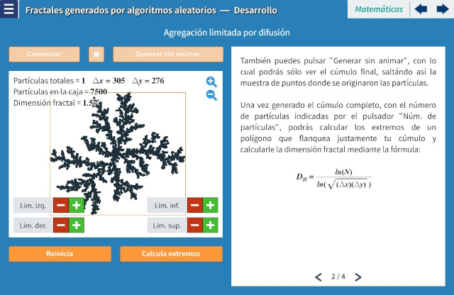 Objetivo: Continuando el tema introducido en la unidad “La dimensión fractal: fractales generados por algoritmos no aleatorios”, la presente unidad lidia con fractales generados por algoritmos que involucran aleatoriedad, en particular el generado mediante agregación limitada por difusión (DLA, por sus siglas en inglés de Diffusion Limited Aggregation). Se estudia otra forma de cálculo de la dimensión fractal para ellos (una forma de conteo de celdas conocido en inglés como “box counting method”), y se pone en relación con el ejemplo del fractal de Hilbert de la unidad previa. Adicionalmente, se hace una asociación con los fractales presentes en la naturaleza y se sugiere a la dimensión fractal como una “huella digital” del algoritmo de formación de dichos fractales, misma que compartirán todos con un algoritmo semejante.
