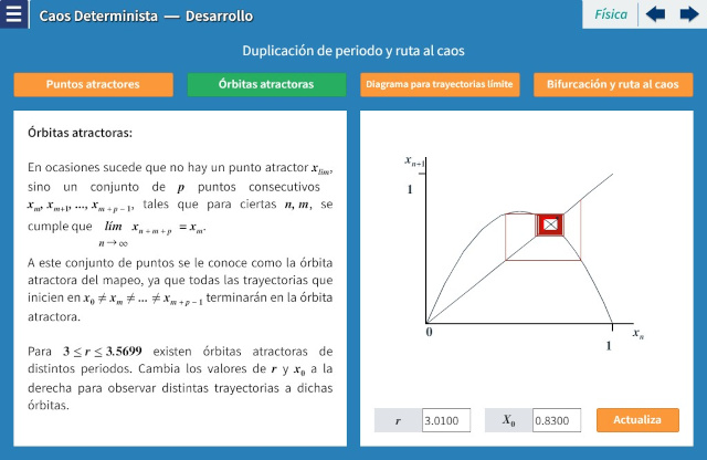 Objetivo: Se introducirá al alumno al tema de Caos. Se desarrollará el tema desde el ámbito de los mapeos discretos unidimensionales, en especial el mapeo logístico, para que el alumno conozca las principales características del caos, y algunos métodos de observación y cuantificación.