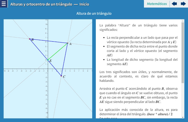 Objetivo: En un triángulo podemos distinguir cuatro centros: ortocentro, circuncentro, baricentro, incentro; que son los puntos de intersección de cuatro grupos de rectas notables: alturas, mediatrices, medianas, bisectrices. En este interactivo empezaremos con las alturas y el ortocentro, probamos, usando el Teorema de Ceva que las alturas de un triángulo son concurrentes.