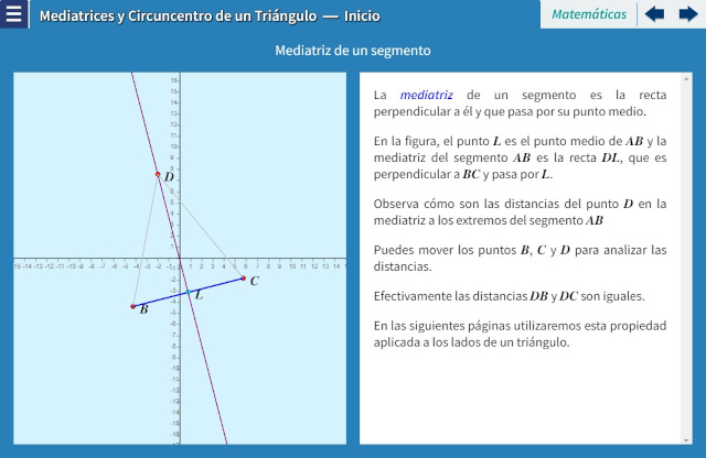 Objetivo: En un triángulo podemos distinguir cuatro centros: ortocentro, circuncentro, baricentro, incentro; que son los puntos de intersección de cuatro grupos de rectas notables: alturas, mediatrices, medianas, bisectrices. En este interactivo estudiamos las mediatrices y el circuncentro, probamos que las mediatrices de un triángulo son concurrentes.