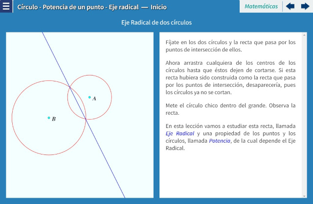 Objetivo: La potencia de un punto respecto a un círculo es una propiedad que tiene que ver con la distancia de él a dicho círculo, pero da más información, por lo cual es posible hacer construcciones y obtener resultados interesantes a partir de ella. En particular, se puede definir la recta radical de dos círculos, que generaliza a la recta que pasa por los puntos de interseccion, aún en el caso en el que los círculos no se corten. La idea de este interactivo es mostrar las construcciones de potencia de un punto y eje radical y algunas propiedades de ellos.
