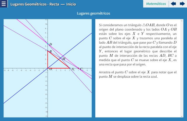 Objetivo: El objetivo de esta serie de interactivos es estudiar ejemplos planteados que cuentan con condiciones que debe cumplir un punto del plano para poder ser considerado un elemento del lugar geométrico. Una vez establecida las condiciones, procederemos a encontrar la ecuación que debe satisfacerse para identificar la curva. En este caso, se plantea una condición que genera una recta.