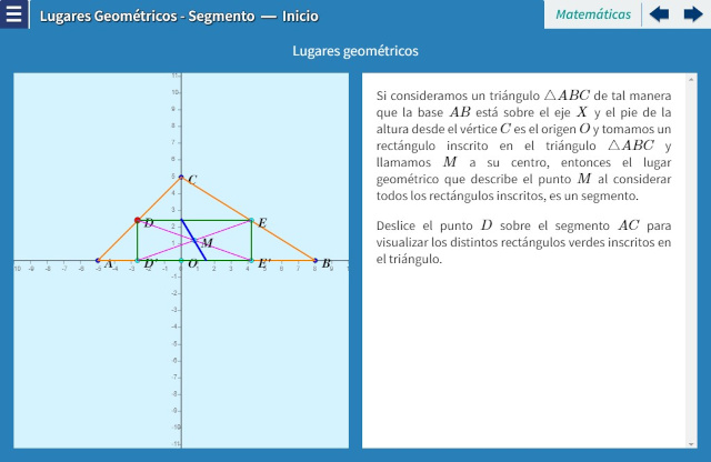 Objetivo: El objetivo de esta serie de interactivos es estudiar ejemplos planteados que cuentan con condiciones que debe cumplir un punto del plano para poder ser considerado un elemento del lugar geométrico. Una vez establecida las condiciones, procederemos a encontrar la ecuación que debe satisfacerse para identificar la curva. En este caso, se plantea encontrar el lugar geométrico de los puntos medios de ciertos rectángulos inscritos en un triángulo.