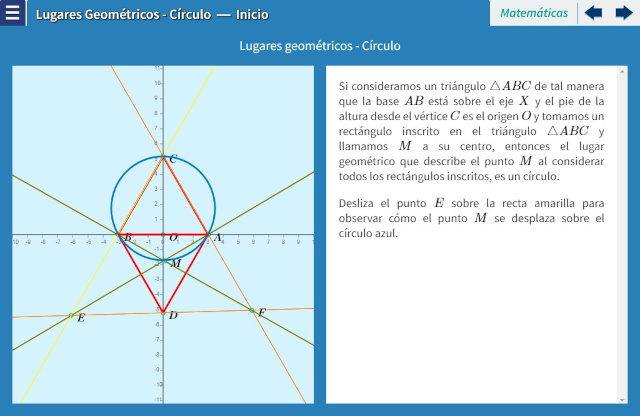 Objetivo: El objetivo de esta serie de interactivos es estudiar ejemplos planteados que cuentan con condiciones que debe cumplir un punto del plano para poder ser considerado un elemento del lugar geométrico. Una vez establecida las condiciones, procederemos a encontrar la ecuación que debe satisfacerse para identificar la curva. En este caso, se plantea una condición que genera un círculo.