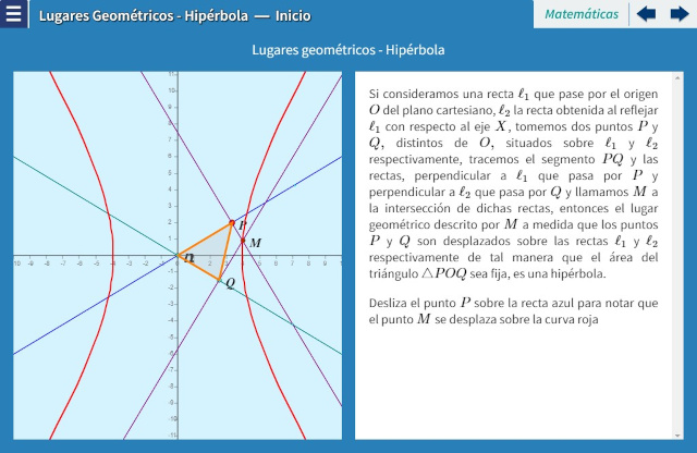 Objetivo: El objetivo de esta serie de interactivos es estudiar ejemplos planteados que cuentan con condiciones que debe cumplir un punto del plano para poder ser considerado un elemento del lugar geométrico. Una vez establecida las condiciones, procederemos a encontrar la ecuación que debe satisfacerse para identificar la curva. En este caso, se hace una construccion del lugar geométrico que describe un punto $M$ cuando un vértice de un triángulo se mueven sobre una recta de manera que el área de dicho triángulo sea constante. Se prueba que dicho lugar geométrico es una hipérbola.